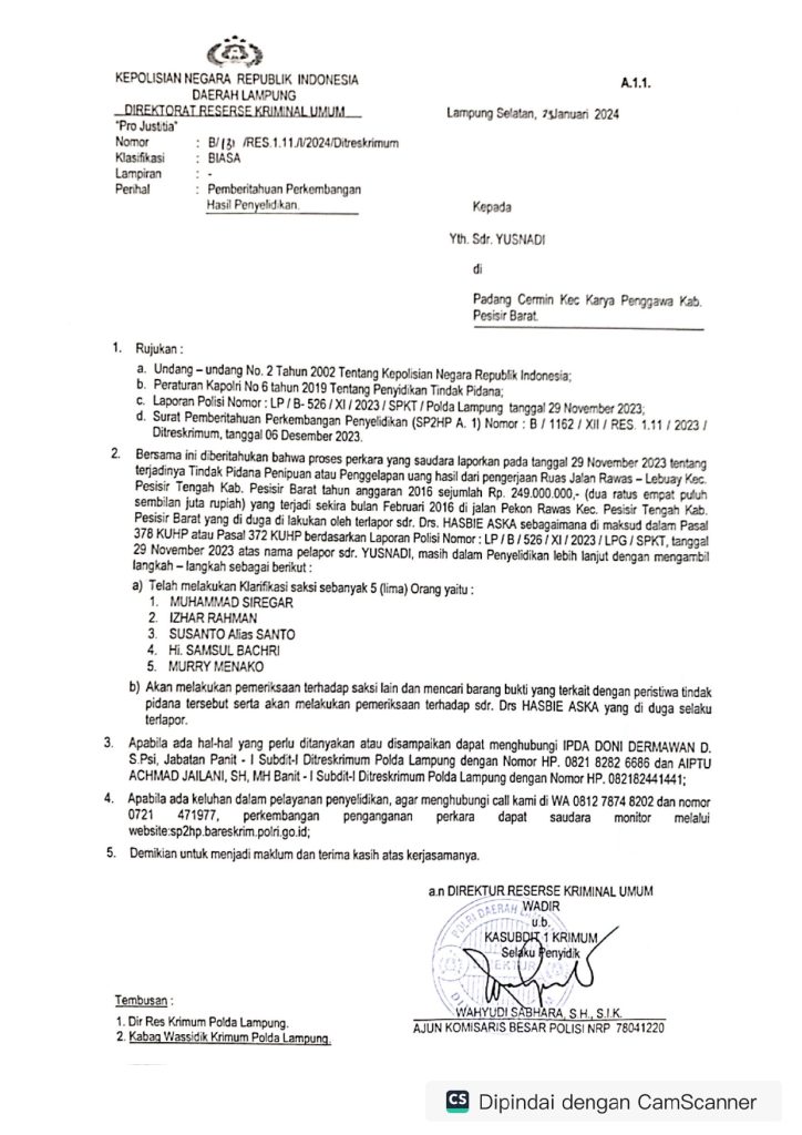 Sementara itu, pihak Polda Lampung seperti yang tertulis dalam Surat yang ditujukan kepada Yusnadi, menyatakan telah melakukan pemeriksaan terhadap saksi lain dan mencari barang bukti yang terkait dan telah melakukan pemeriksaan terhadap sdr. Drs. Hasbie Aska diduga selaku terlapor.